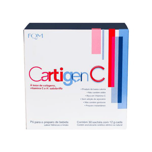 Cartigen C é um pó para preparo de bebida à base de colágeno e vitamina C. O colágeno é uma proteína vital na matriz estrutural da maioria dos tecidos e orgãos, auxiliando na resistência e manutenção da pele, unha e cabelos. Possui sabor de hibiscos e limão.