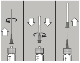3. Gire cuidadosamente a extremidade superior do selo de segurança cinza da seringa, de forma a romper o lacre e, desta forma, destacar a metade superior do lacre. Uma vez destacada a parte superior do lacre, encaixe cuidadosamente a agulha na seringa com um movimento giratório, sem retirar o protetor da agulha. Utilize a agulha mais longa (código 22G1½ - 0,7 x 40).