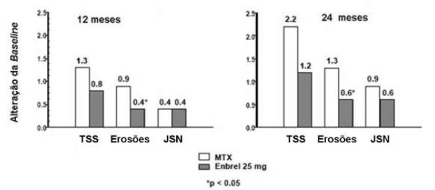 A progressão radiográfica em 12 meses foi significativamente menor no grupo tratado com Etanercepte (susbtância ativa) que no grupo tratado com metotrexato, enquanto que o grupo que recebeu a associação foi significativamente melhor na desaceleração da progressão radiográfica que os grupos em monoterapia.
