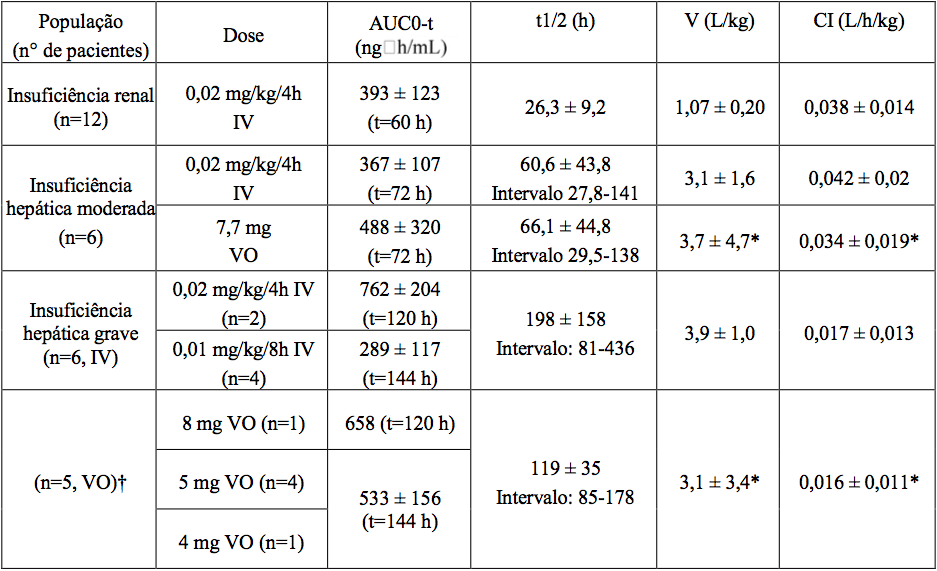 As médias dos parâmetros farmacocinéticos do Tacrolimo monoidratado (substância ativa), após administração única em pacientes com insuficiência hepática e renal, são dadas na seguinte tabela.