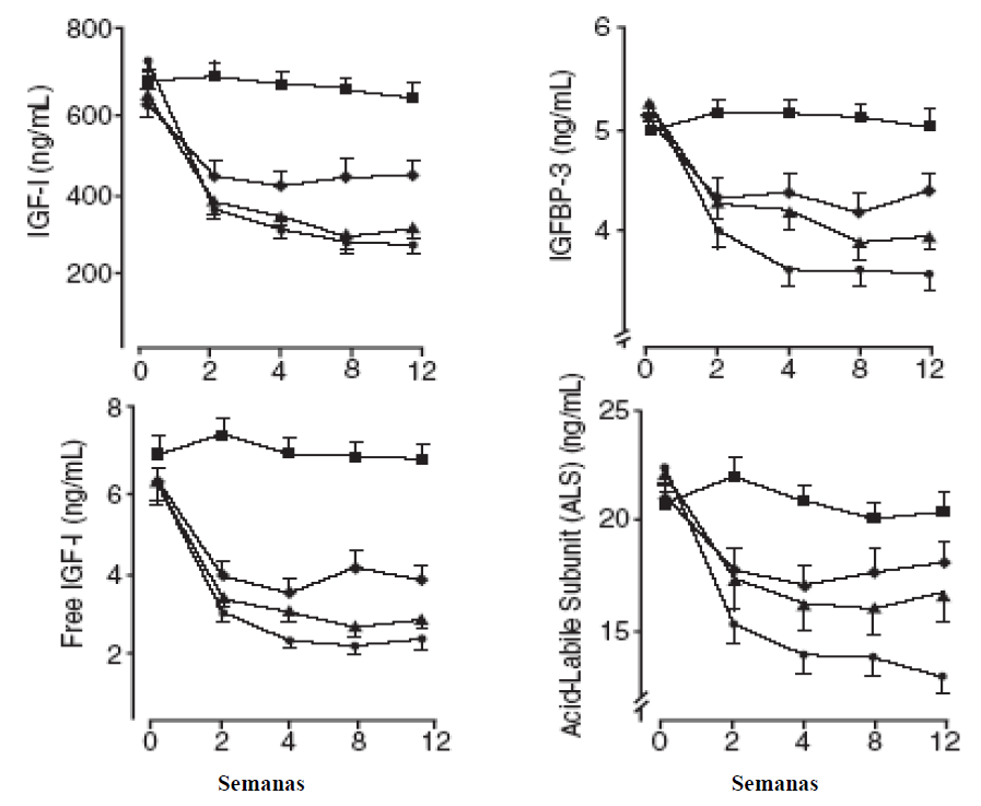 Comparado com placebo, em todas as visitas no inicio do tratamento, houve também reduções nos níveis séricos de IGF-I livre, de IGFBP-3 e de ALS (vide Figura 1).