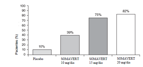 O desfecho primário de eficácia foi a alteração da porcentagem em concentração do IGF-I desde o baseline até a semana 12. Estes 3 grupos que receberam pegvisomanto demonstraram reduções estatisticamente significativas nos níveis séricos de IGF-I (p<0,01) comparado com o grupo de placebo (Tabela 1).