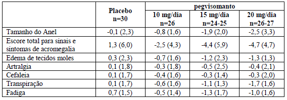 A tabela 2 mostra os efeitos do tratamento com pegvisomanto no tamanho do anel (tamanho padrão de joalheiro europeu) e nos sinais e sintomas de acromegalia. Cada escore individual foi baseado em uma escala ordinal de nove pontos (0=ausente e 8=grave e incapacitante) e o escore total foi derivado da soma dos escores individuais.