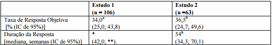 Neste estudo, a TRO foi de 34,0 % (IC de 95% = 25,0%; 43,8%). As medianas de TPT, SLP, DR e SG ainda não foram atingidas.