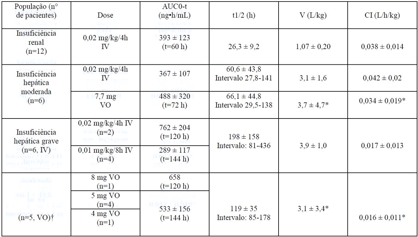 As médias dos parâmetros farmacocinéticos do tacrolimo, após administração única em pacientes com insuficiência hepática e renal, são dadas na tabela abaixo.