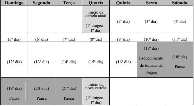 Deixe de tomar as drágeas da cartela atual, faça uma pausa de 7 dias, ou menos, contando inclusive o dia no qual esqueceu de tomar a drágea e inicie uma nova cartela. Caso deseje manter o mesmo dia da semana para início de tomada, a pausa pode ser menor do que 7 dias. Por exemplo: se a cartela foi iniciada em uma quarta-feira e você esqueceu de tomar a drágea na sexta-feira da última semana, pode iniciar a nova cartela na quarta-feira da semana seguinte ao esquecimento, praticando, desta forma, uma pausa de apenas 5 dias. Veja esquema ilustrativo