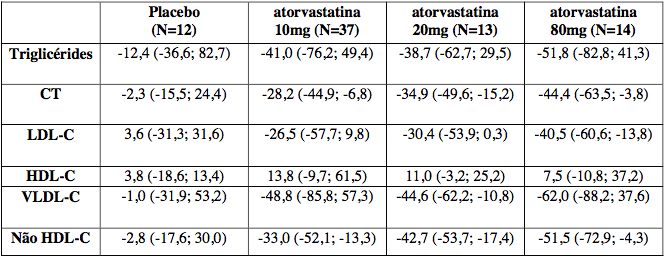 A resposta à utilização de atorvastatina em 64 pacientes com hipertrigliceridemia isolada tratados em vários estudos clínicos está na tabela 1. Para os pacientes tratados com atorvastatina, o valor basal médio (mín; máx) de triglicérides foi de 565 (variando entre 267 e 1502).