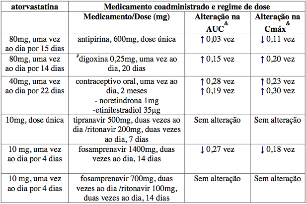 O efeito de medicamentos coadministrados sobre a farmacocinética de atorvastatina, bem como o efeito da atorvastatina sobre a farmacocinética de medicamentos coadministrados é resumido nas Tabelas 5 e 6.