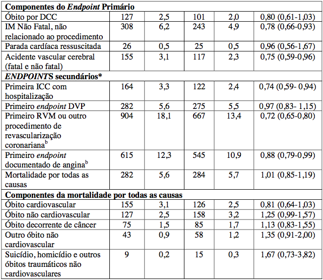 * Principal endpoint cardiovascular (MCVE) = morte devido doença cardíaca coronariana, infarto do miocárdio não fatal, parada cardíaca ressucitada e AVC fatal e não fatal.