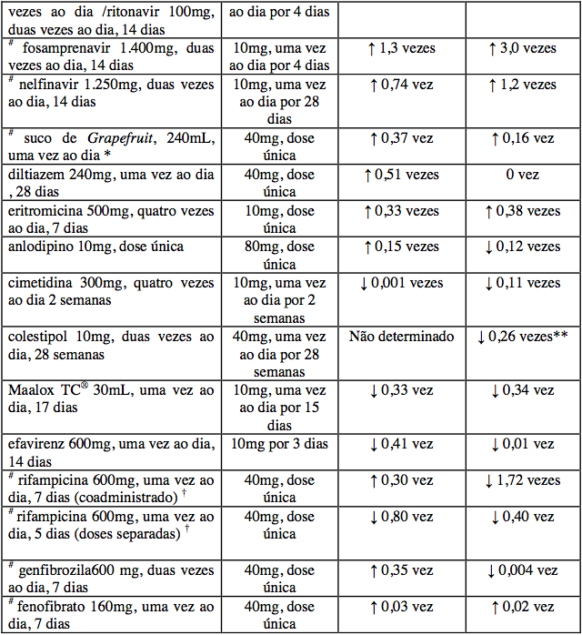 † Devido ao mecanismo de dupla interação da rifampicina, é recomendada a coadministração simultânea de atorvastatina com rifampicina, visto que o atraso na administração de atorvastatina após administração de rifampicina foi associada a uma redução significativa das concentrações plasmáticas de atorvastatina.