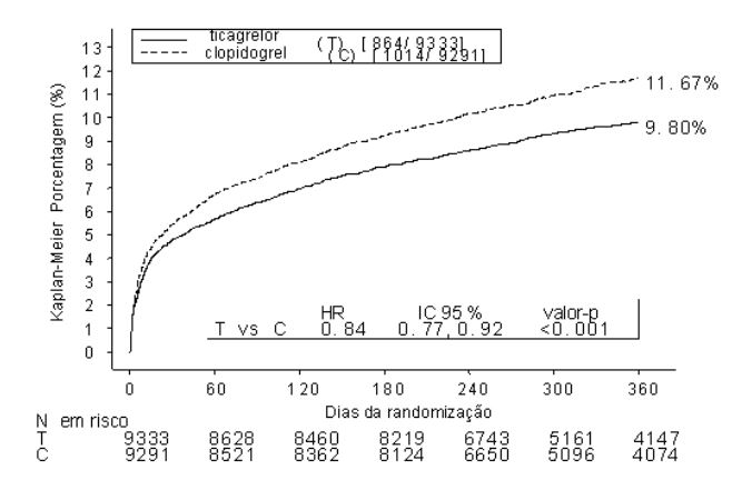 Ticagrelor (substância ativa) demonstrou uma redução do risco relativo estatisticamente significativo de 16% (RRA 1,1%) para IM e uma redução do risco relativo de 21% (RRA 1,1%) para morte CV. Tratar 91 pacientes com Ticagrelor (substância ativa) ao invés de clopidogrel prevenirá 1 morte CV.