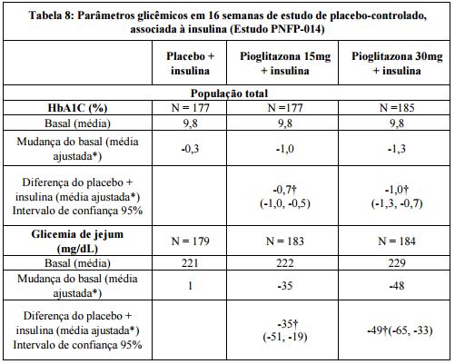 Em um estudo controlado por placebo, os pacientes com controle glicêmico inadequado, apesar de um período de três meses para otimização de insulina, foram randomizados para pioglitazona ou placebo durante 12 meses. Os pacientes que receberam pioglitazona tiveram uma redução média na HbA1c de 0,45% em comparação com os que continuaram a tomar somente insulina e uma redução da dose de insulina no grupo tratado com pioglitazona.