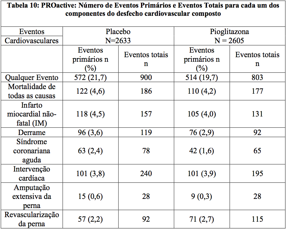 Um total de 514 (19,7%) dos pacientes tratados com pioglitazona e 572 (21,7%) dos pacientes tratados com placebo apresentaram pelo menos um evento do desfecho primário composto (hazard ratio 0,90; Intervalo de confiança 95%: 0,80, 1,02, p = 0,10). Embora não haja diferença estatisticamente significativa entre a pioglitazona e o placebo para a incidência de um primeiro evento dentro deste composto em 3 anos, não houve aumento na mortalidade nem no número total de eventos macrovasculares com pioglitazona (Tabela 10 abaixo). A porcentagem de pacientes que tiveram um caso de insuficiência cardíaca grave foi maior entre os pacientes tratados com pioglitazona (5,7%, n = 149) do que para os pacientes tratados com placebo (4,1%, n = 108).