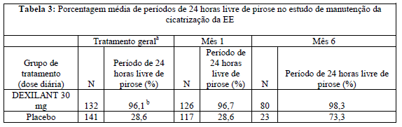 O efeito Dexlansoprazol 30 mg na manutenção do alívio da pirose também foi avaliado. Após a entrada no estudo de manutenção, a pirose com gravidade baixa da maioria dos pacientes foi classificada como inexistente. Dexlansoprazol (substância ativa) 30 mg demonstrou uma porcentagem significativamente maior de períodos de 24 horas sem pirose em comparação com placebo durante o período de 6 meses de tratamento (vide Tabela 3). A maioria dos pacientes tratados com placebo descontinuou o tratamento devido a recaída de EE entre dois e seis meses.