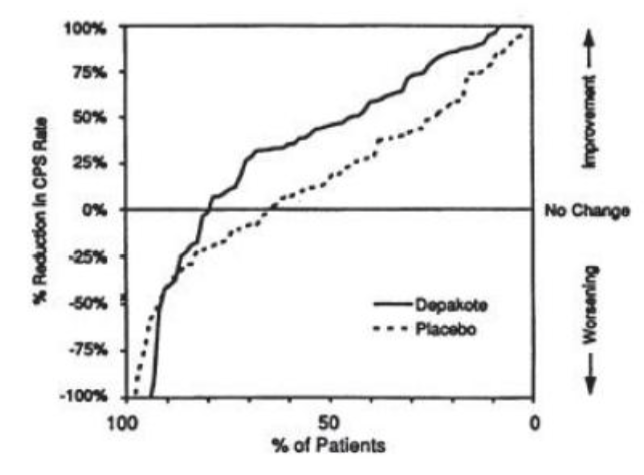 A Figura 2 apresenta a proporção de pacientes (eixo X) cuja porcentagem de redução das taxas de crises parciais complexas no início foi pelo menos tão elevada quanto a indicada no eixo Y no estudo de tratamento adjuvante. Uma redução percentual positiva indica uma melhora (ou seja, redução na frequência das crises), enquanto que uma redução percentual negativa indica uma piora. Deste modo, em uma exposição deste tipo, a curva que demonstra um tratamento efetivo é deslocada para a esquerda da curva do placebo. O resultado demonstrou que a proporção de pacientes que atingiram um determinado nível de melhoria com divalproato de sódio foi consistentemente maior do que os pacientes que usaram placebo. Por exemplo, 45% dos pacientes tratados com divalproato de sódio tiveram uma redução na taxa de CPCs maior ou igual a 50%, comparado a 23% de melhoria para os pacientes que usaramplacebo.
