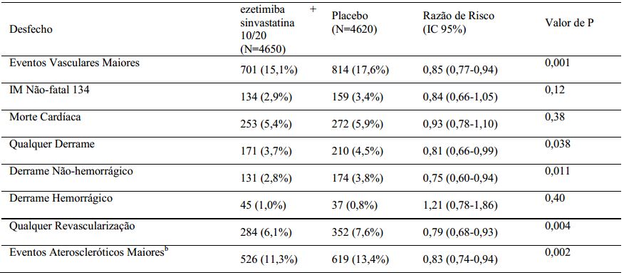 A análise do desfecho primário mostrou que ezetimiba + sinvastatina reduziu significativamente o risco de eventos vasculares maiores (749 pacientes com eventos no grupo placebo versus 639 no grupo ezetimiba + sinvastatina) com uma redução do risco relativo de 16% (p=0,001) (veja Figura 1).