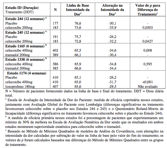 O celecoxibe foi utilizado para tratar pacientes que apresentavam lombalgia não neuropática preexistente de duração ?12 semanas. Na tabela a seguir, os resultados de eficácia de 5 estudos clínicos são apresentados utilizando a Escala de Avaliação da Intensidade da Dor do Paciente (escala visual analógica de 100mm), a partir da linha de base ao fim do tratamento: