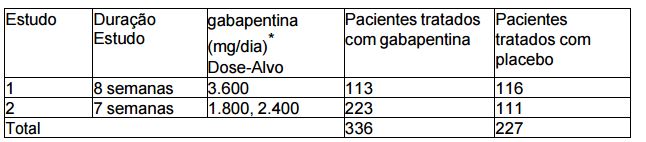 Cada estudo incluiu uma fase duplo-cega de 7 ou 8 semanas de duração (3 ou 4 semanas de titulação e 4 semanas de dose fixa). Os pacientes iniciaram o tratamento com titulação até 900 mg/dia de gabapentina durante 3 dias. As doses foram então tituladas em aumentos de 600 a 1.200 mg/dia, a intervalos de 3 a 7 dias até a dose-alvo, por 3 a 4 semanas. Os pacientes registraram a dor em um diário por meio de uma escala numérica de gradação da dor de 11 pontos, variando de 0 (sem dor) a 10 (pior dor possível). Foi exigida para randomização uma pontuação média de dor durante a fase inicial de no mínimo 4. As análises foram conduzidas utilizando-se a população de intenção de tratamento (todos os pacientes randomizados que receberam pelo menos uma dose do medicamento em estudo).