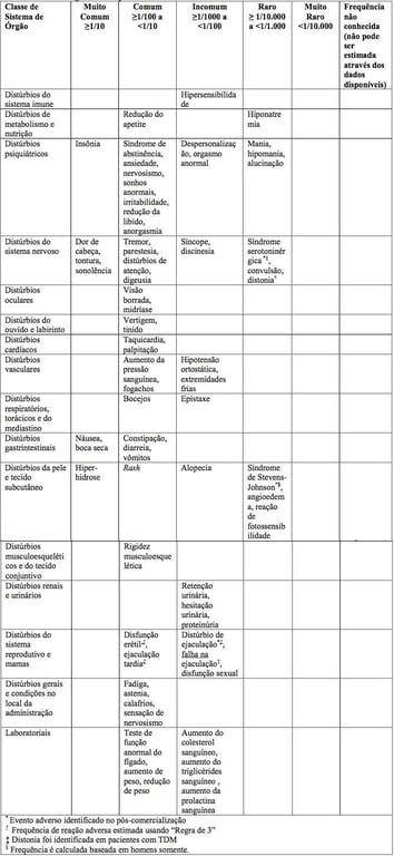 Durante a comercialização dos IRSNs e ISRSs, houve relatos espontâneos de eventos adversos que ocorreram na descontinuação desses medicamentos, especialmente quando repentina, incluindo os seguintes: humor disfórico, irritabilidade, agitação, tontura, distúrbios sensoriais (por exemplo, parestesias como sensações de choque elétrico), ansiedade, confusão, dores de cabeça, letargia, labilidade emocional, insônia, hipomania, tinido e convulsões. Embora esses eventos sejam geralmente autolimitados, houve relatos de sintomas sérios de descontinuação.