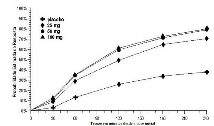 Em 1 dos 3 estudos, houve uma porcentagem estatisticamente e significativamente maior de pacientes com resposta à cefaleia em 2 e 4 horas no grupo de 50 mg ou 100 mg quando comparado com os grupos de dose de 25 mg. Não foram observadas diferenças estatisticamente significativas entre os grupos de dose de 50 mg e 100 mg em nenhum dos estudos. Os resultados dos 3 estudos clínicos controlados estão resumidos na Tabela 1.