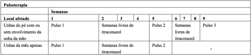 * A pulsoterapia consiste na administração de 200 mg (2 cápsulas) duas vezes ao dia durante 7 dias. Recomendam-se dois pulsos para infecções das unhas das mãos e três pulsos para infecções das unhas dos pés. Os tratamentos em pulso são sempre separados por intervalo de 3 semanas sem medicamento. A resposta clínica será evidente à medida que a unha crescer após a descontinuação do tratamento.