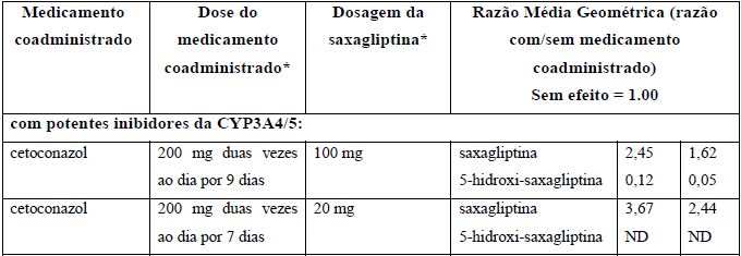 Alguns medicamentos como cetoconazol (usado no tratamento de doenças causadas por fungos) aumentam a concentração de saxagliptina no sangue devido interação com as enzimas do fígado.