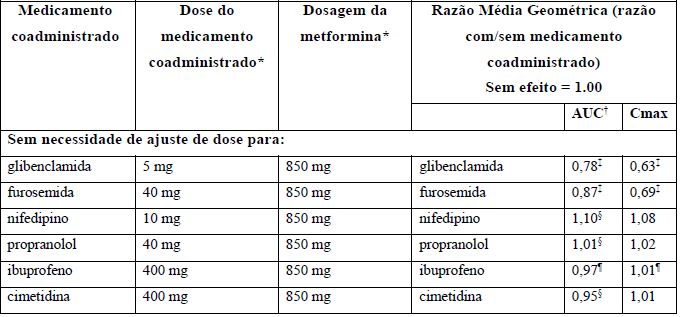 Medicamentos concomitantes que podem afetar a função renal ou resultar em alteração hemodinâmica significativa (alteração no sistema circulatório)ou podem interferir na concentração de metformina, como drogas catiônicas que são eliminadas pelos rins, devem ser usados com cautela.