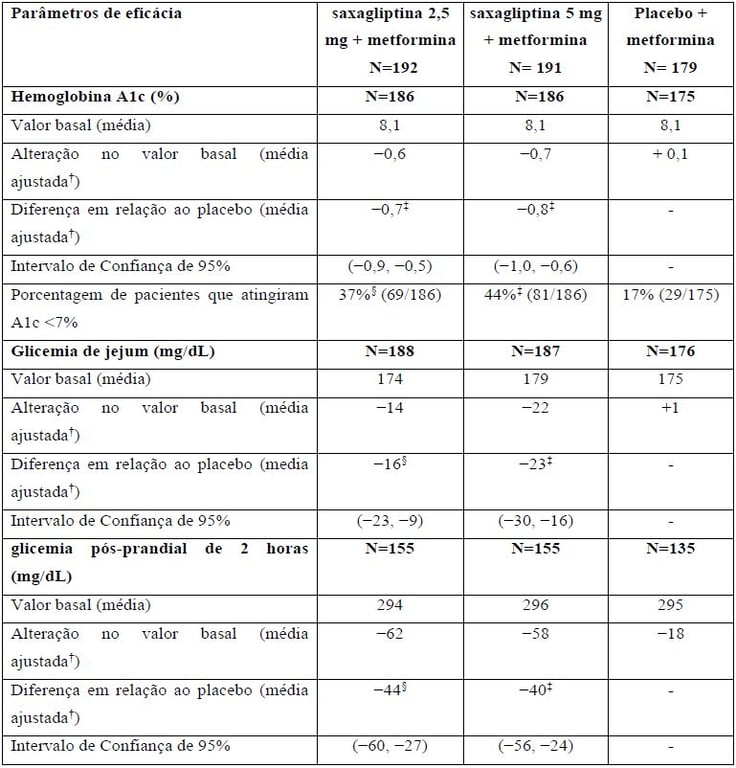 Em combinação com a metformina de liberação imediata, a Saxagliptina 2,5 mg e 5 mg promoveu melhora significativa em HbA1c, GJ, e GPP comparadas com o grupo placebo mais metformina de liberação imediata (Tabela 2). Alterações médias do valor basal de HbA1c ao longo do tempo e no desfecho são mostrados na Figura 1.