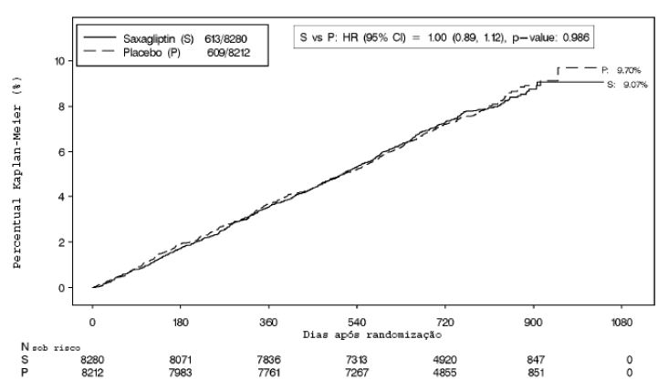 O desfecho primário de segurança e eficácia foi um desfecho composto, consistindo do tempo para primeira ocorrência de qualquer um dos eventos adversos CV graves (MACE, sigla em inglês): morte CV, infarto do miocárdio não fatal, acidente vascular cerebral isquêmico não fatal. O objetivo primário de segurança do estudo foi estabelecer que o limite superior do IC bi-caudal de 95% para a razão do risco estimado, comparando a incidência do desfecho composto por morte CV, infarto do miocárdio não fatal ou acidente vascular cerebral isquêmico não fatal, observado no grupo Saxagliptina daquele observado no grupo placebo foi < 1,3.