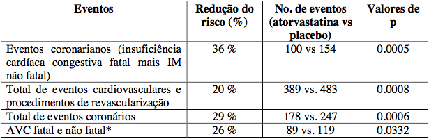 A atorvastatina 80mg reduziu o risco de endpoint primário de AVC fatal e não fatal em 15% [hazard ratio (HR)] 0,85; IC 95%, 0,72-1,00; p=0,05 ou 0,84; IC 95%; 0,71-0,99; p=0,03 após ajuste para fatores basais) comparado com o placebo. A atorvastatina 80mg reduziu significativamente o risco de eventos coronarianos principais (HR 0,67; IC 95%, 0,51-0,89; p=0,006), qualquer evento de DAC (HR 0,60; IC 95%, 0,48-0,74; p<0,001), e procedimentos de revascularização (HR 0,57; IC 95%, 0,44-0,74; p<0,001).