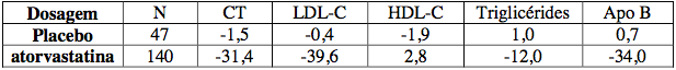 No grupo da atorvastatina, o LDL-C foi reduzido para uma média de 2,04mmol/L ± 0,8 (78,9mg/dL ± 30) quando comparado ao período basal de 3,89mmol/L ± 0,7 (150mg/dL ± 28), e no grupo da pravastatina o LDL-C foi reduzido para uma média de 2,85mmol/L ± 0,7 (110mg/dL ± 26) quando comparado ao período basal de 3,89mmol/L ± 0,7 (150mg/dL ± 26) (p < 0,0001). A atorvastatina também reduziu significativamente a média do CT em 34,1% (pravastatina: -18,4%, p<0,0001), os níveis médios de TG em 20% (pravastatina: - 6,8%, p<0,0009) e a média de apolipoproteína B em 39,1% (pravastatina: -22,0%, p<0,0001). A atorvastatina aumentou o HDL-C em 2,9% (pravastatina: +5,6%, p = NS).