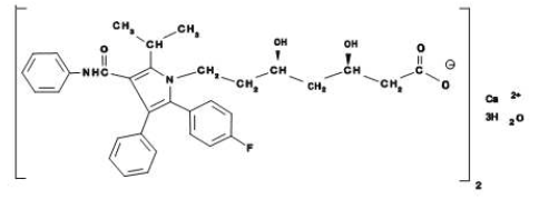 A fórmula empírica de atorvastatina cálcica é (C33H34FN2O5)2Ca • 3H2O e o seu peso molecular é 1209,42. A sua fórmula estrutural é: