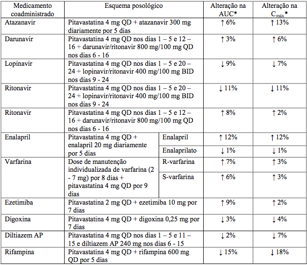 * Os dados apresentados como alteração em x vezes representam a razão entre a coadministração e a pitavastatina sozinha (ou seja, 1 vez = sem alteração). Os dados apresentados como alteração % representam a diferença % em relação à pitavastatina sozinha (ou seja, 0% = sem alteração).