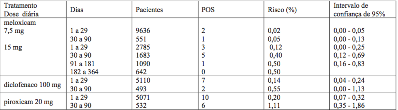 Realizou-se uma análise conjunta de 35 estudos clínicos envolvendo pacientes tratados com meloxicam com indicação para osteoartrite, artrite reumatoide e espondilite anquilosante. O tempo de exposição ao meloxicam nesses estudos variou de 3 semanas a um ano (a maioria dos pacientes foi admitida em estudos de um mês).