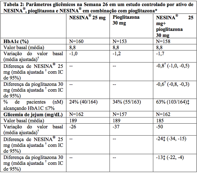 Em um estudo de 26 semanas, duplo-cego, controlado por ativo, um total de 655 pacientes (HbA1c média basal = 8,8%) foram randomizados para receber Benzoato de Alogliptina (substância ativa) 25 mg isolado, pioglitazona 30 mg isolada, Benzoato de Alogliptina (substância ativa) 12,5 mg com pioglitazona 30 mg ou Benzoato de Alogliptina (substância ativa) 25 mg com pioglitazona 30 mg uma vez ao dia. A administração concomitante de Benzoato de Alogliptina (substância ativa) 25 mg com pioglitazona 30 mg resultou em melhoria estatisticamente significativa na HbA1c e GJ basal comparado a Benzoato de Alogliptina (substância ativa) 25 mg isolado e a pioglitazona 30 mg isolada (Tabela 2). Um total de 3% dos pacientes recebendo Benzoato de Alogliptina (substância ativa) 25 mg administrado concomitantemente com pioglitazona 30 mg, 11% daqueles recebendo Benzoato de Alogliptina (substância ativa) 25 mg isolado e 6% daqueles recebendo pioglitazona 30 mg isolada necessitaram de resgate glicêmico.