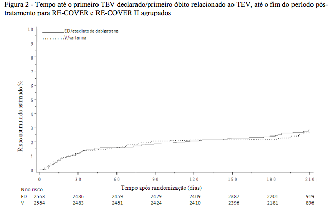 O estudo RE-MEDY demonstrou que o tratamento com etexilato de dabigatrana 150 mg 2x/dia foi não inferior à varfarina (p=0,0135 para não inferioridade). Eventos hemorrágicos (grave/clinicamente relevante; qualquer sangramento) foram significativamente menores nos pacientes que receberam etexilato de dabigatrana em comparação à varfarina.