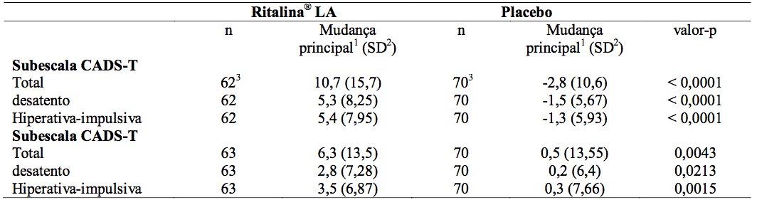 O CADS-T avalia sintomas de hiperatividade e desatenção. A análise da variável de eficácia primária mostrou uma diferença de tratamento significativa em favor do tratamento da Cloridrato De Metilfenidato LA (cápsulas de liberação modificada) (p<0,0001). Um efeito estatisticamente significativo no tratamento para a Cloridrato De Metilfenidato LA (cápsulas de liberação modificada) em relação ao placebo também foi encontrado em todas as análises dos CADS das variáveis de eficácia secundária, bem como em duas análises post-hoc para os subtipos de diagnóstico de TDAH (tipo combinado, tipo desatento). Os resultados das análises de eficácia primária e secundária encontram-se resumidos na Tabela a seguir.