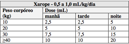 A dose ponderal usual é de 0,5-1,0 mL/kg/dia de xarope (que corresponde a 1,77 a 3,54 mg/kg/dia), dividida em 3 tomadas diárias ou a critério médico, podendo a dose total usual ser dividida por 4: 1 dose pela manhã, 1 dose à tarde e 2 doses juntas à noite.