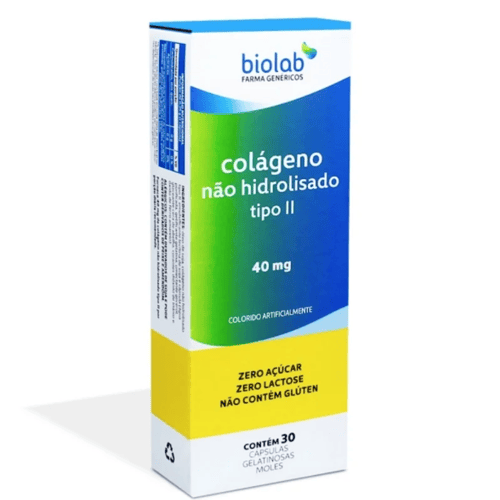 O que é e para que serve o Colágeno Não Hidrolisado Tipo II Biolab?O colágeno não hidrolisado tipo II é um suplemento alimentar que auxilia na manutenção da cartilagem articular.Como tomar o Colágeno Não Hidrolisado Tipo II Biolab?Recomenda-se ingerir 1 cápsula ao dia ou conforme orientação do médico e/ou nutricionista.Por que tomar o Colágeno Não Hidrolisado Tipo II Biolab?A cartilagem articular é composta por células denominadas condrócitos e pela matriz extracelular, composta principalmente por colágeno tipo II e proteoglicanos. Essas moléculas conferem as propriedades da cartilagem como rigidez e elasticidade.